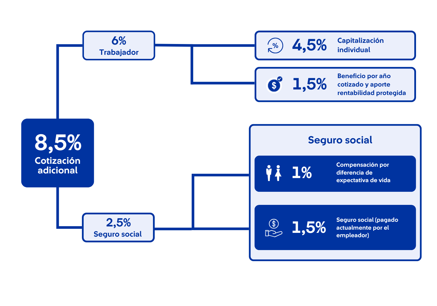 Actualmente, el trabajador es responsable de cotizar un 10% de su sueldo para su ahorro previsional. Con esta reforma, uno de los cambios más significativos involucra la inclusión del empleador, quién será el encargado de incrementar el aporte en un 8,5%, llegando a un total de 18,5%.