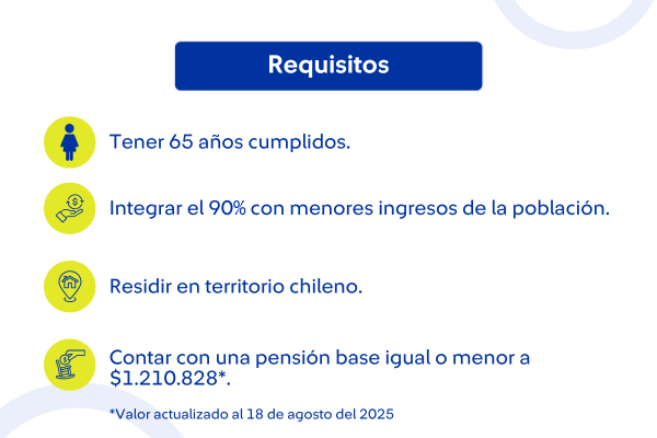 Es un beneficio donde el Estado entrega un monto para todas las personas mayores de 65 años que pertenezcan al 90% de las familias con menores ingresos, según el Registro Social de Hogares. El monto de este beneficio asciende a un máximo de $250.000, el cual se reajusta de acuerdo al IPC.
